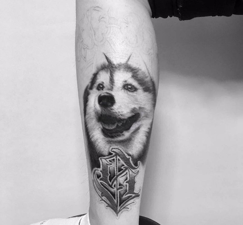 当前位置: 首页 >重庆市纹身店-白乌鸦刺青纹身图案>二哈纹身图片_欧美肖像写实腿部成品动物字符纹身图案