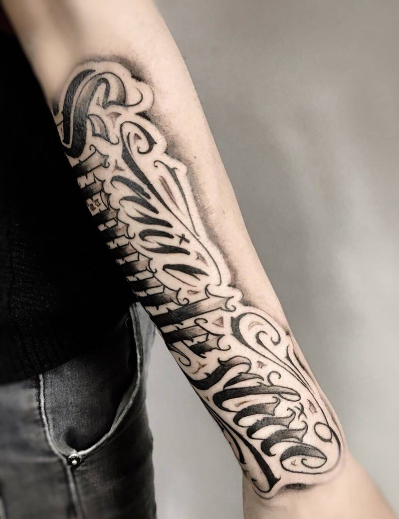 当前位置: 首页 >重庆市纹身店-白乌鸦刺青纹身图案>花体字纹身图片_成品手臂欧美字符原创纹身图案
