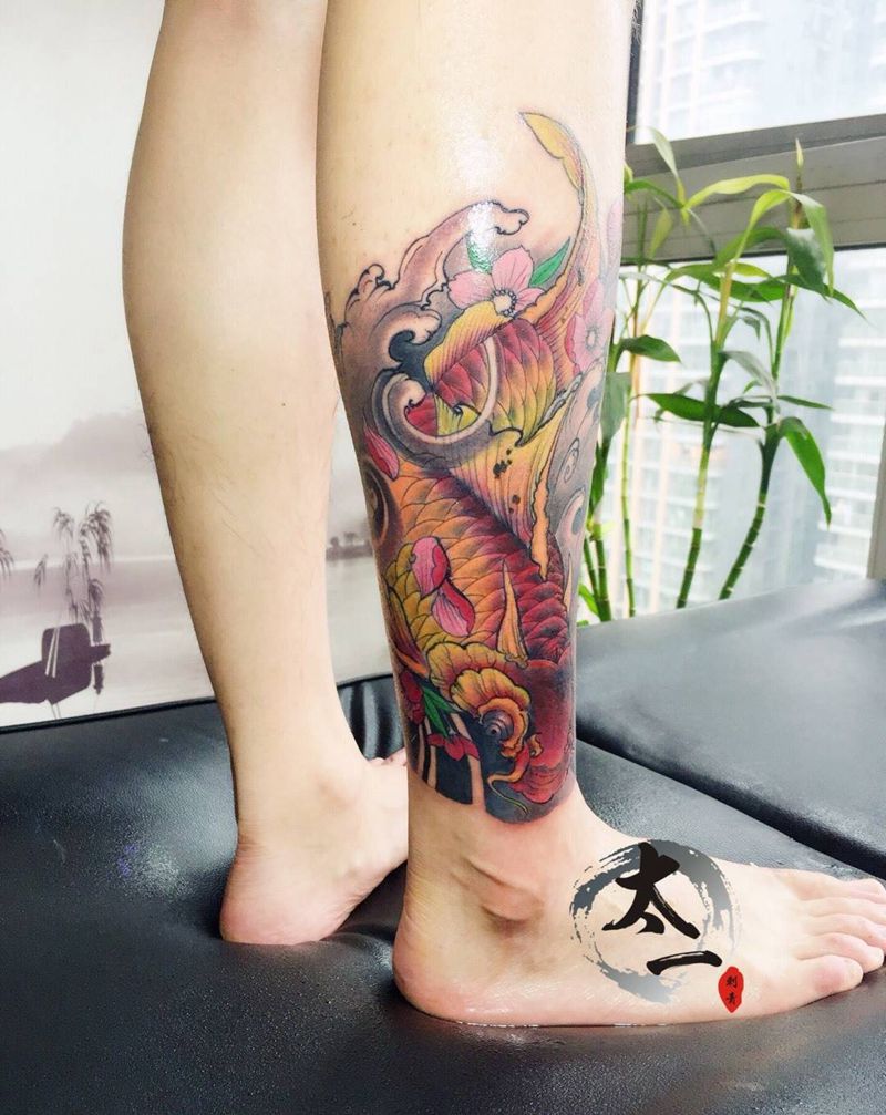 当前位置: 首页 >重庆市纹身店-太一刺青纹身图案>小腿半包鲤鱼,黑灰色彩色对比纹身图片