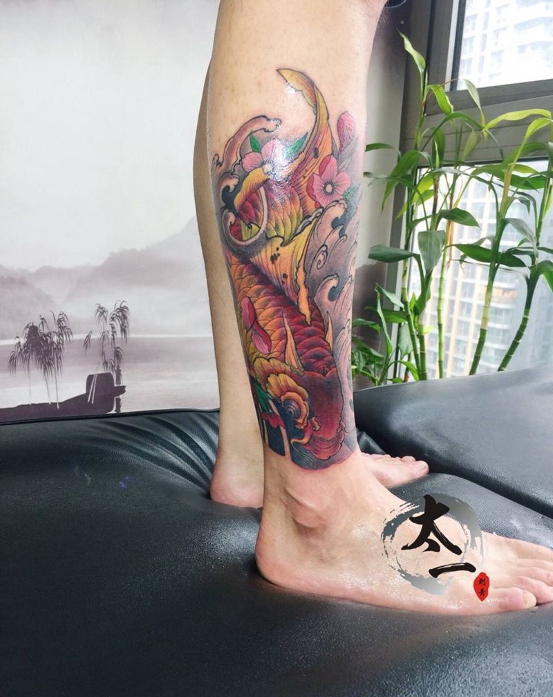 当前位置: 首页 >重庆市纹身店-太一刺青纹身图案>小腿半包鲤鱼,黑灰色彩色对比纹身图片