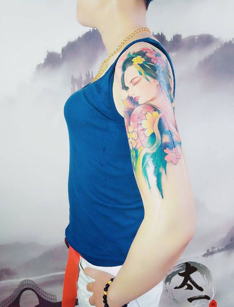 当前位置: 首页 >重庆市纹身店-太一刺青纹身图案>大臂艺妓泼墨风格纹身图片