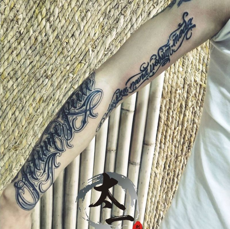 当前位置: 首页 >重庆市纹身店-太一刺青纹身图案>奇卡诺花体大臂➕小臂纹身图片
