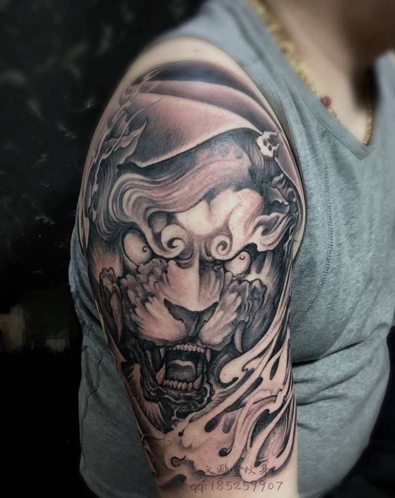 大臂狮子纹身纹身图片_手臂传统动物重庆纹身图案