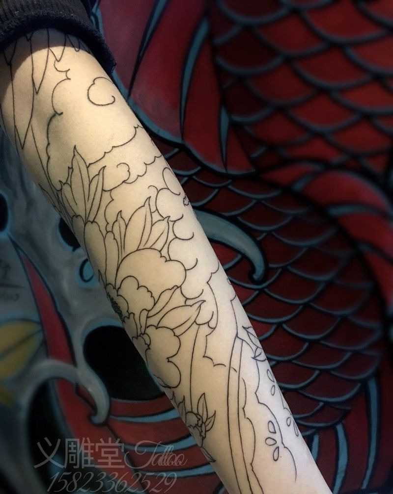 鹤与牡丹花臂线条纹身图片_手臂传统动物植物重庆重庆刺青义雕堂老传统刺青纹身图案