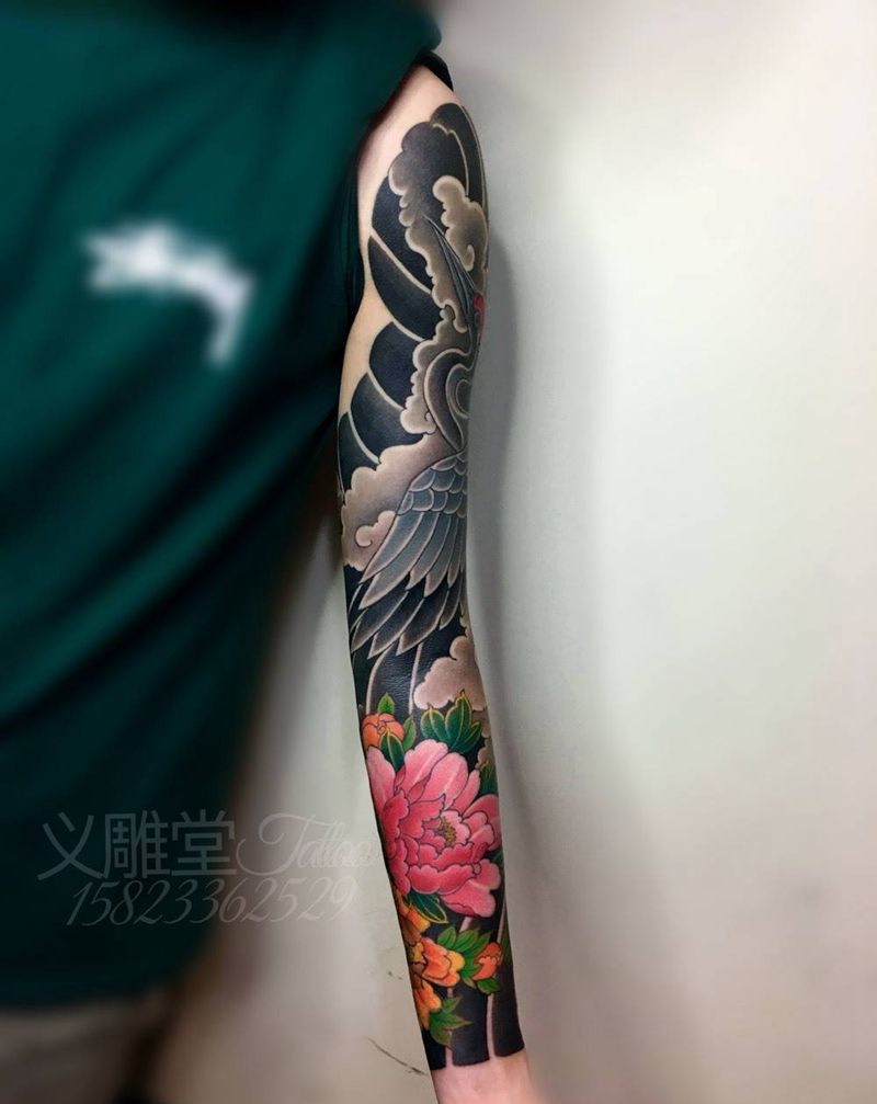 仙鹤牡丹臂纹身图片_手臂传统重庆重庆刺青义雕堂图案培训老传统刺青动物纹身图案