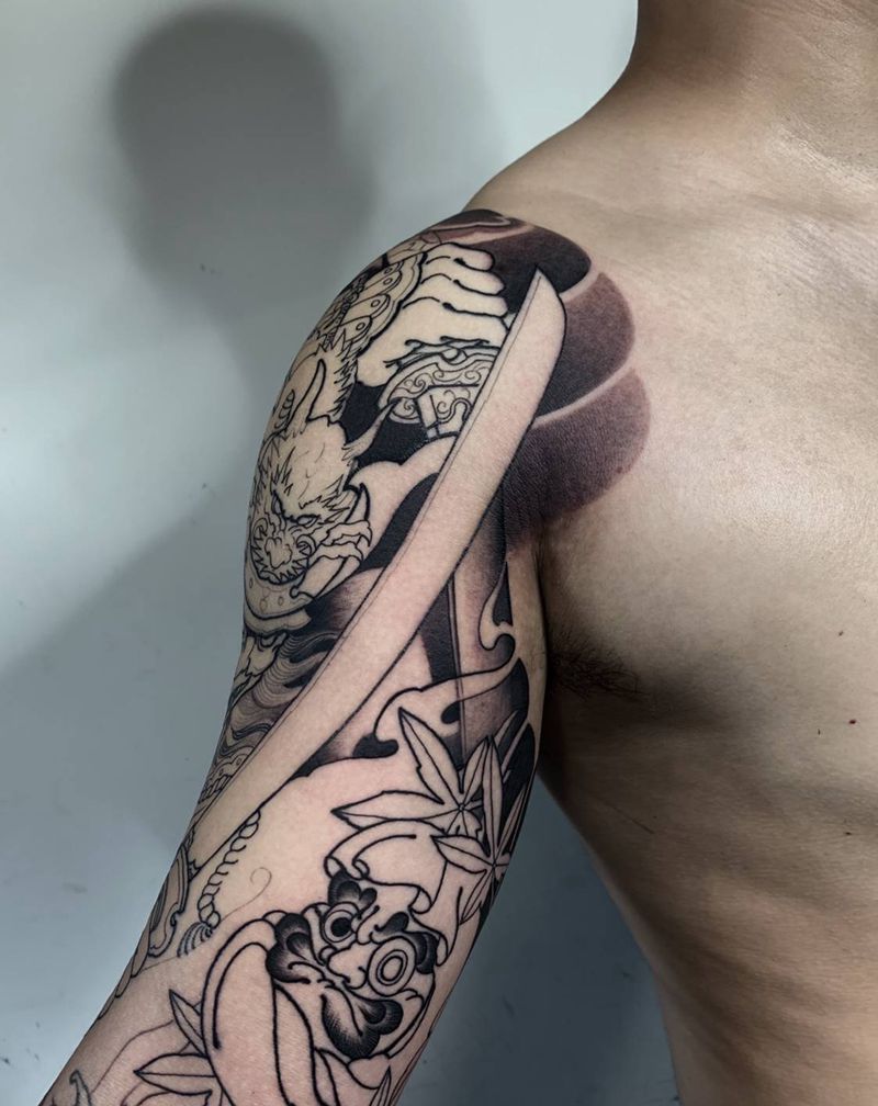手臂武士大臂纹身图片_手臂新传统重庆义雕堂刺青纹身图案