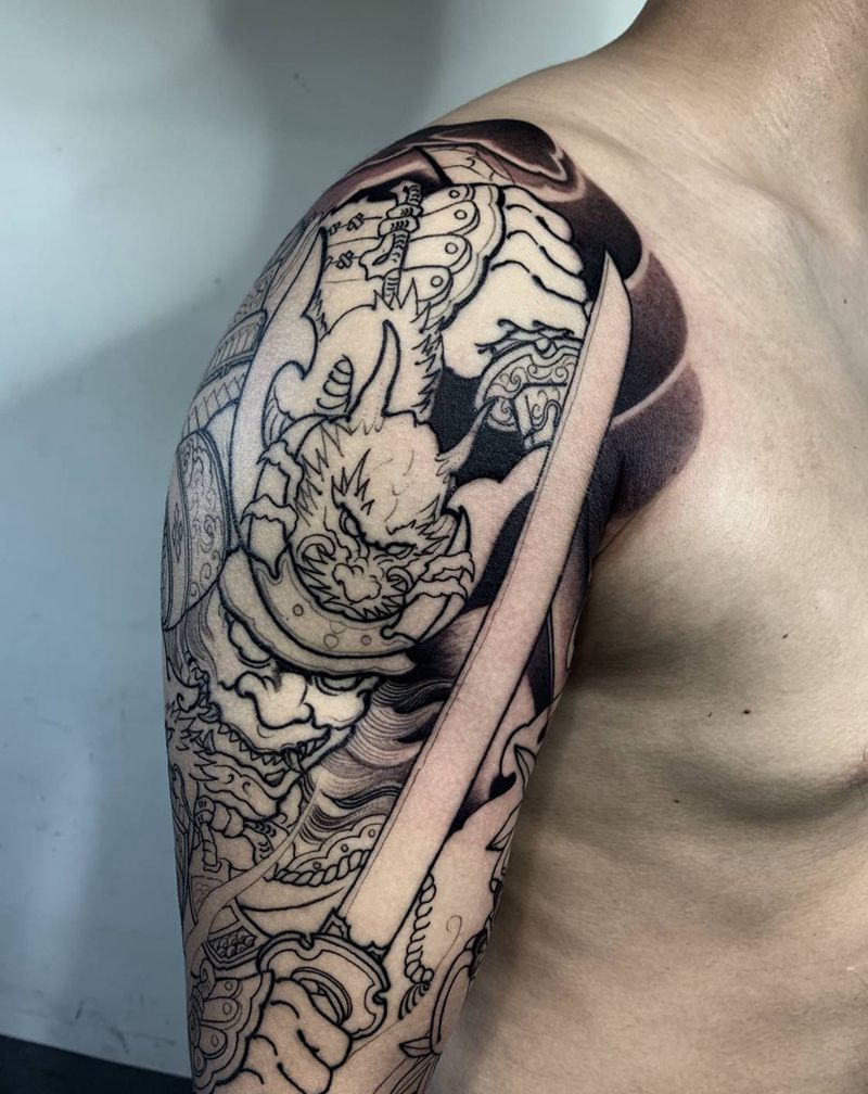 手臂武士大臂纹身图片_手臂新传统重庆义雕堂刺青纹身图案
