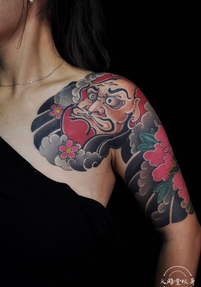 达摩牡丹半胛纹身纹身图片_手臂胸部老传统义雕堂纹身图案
