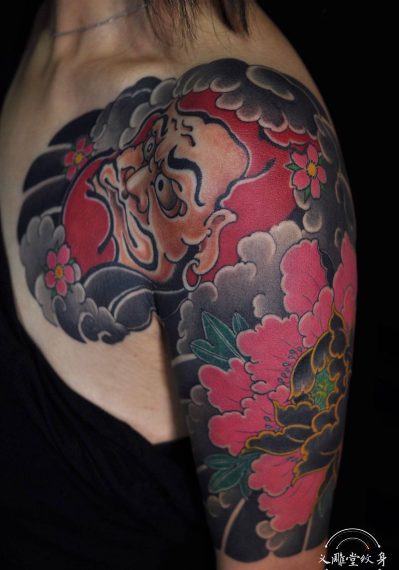 达摩牡丹半胛纹身纹身图片_手臂胸部老传统义雕堂纹身图案