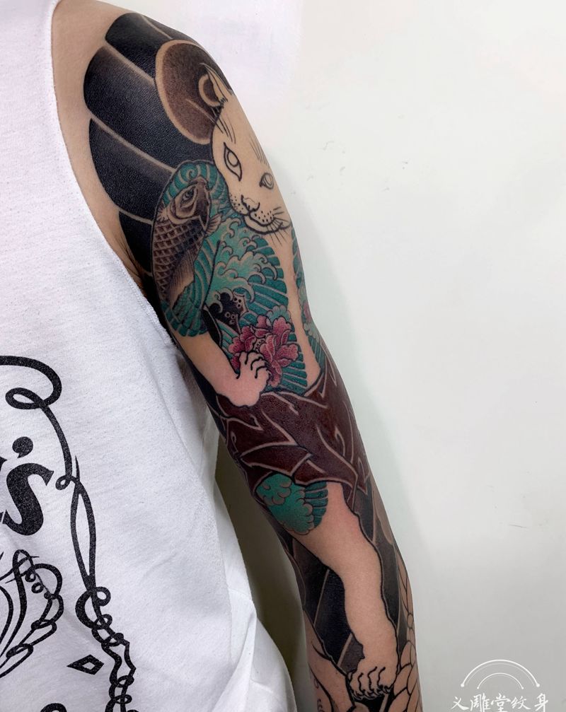 猫臂纹身纹身图片_手臂老传统义雕堂刺青纹身图案