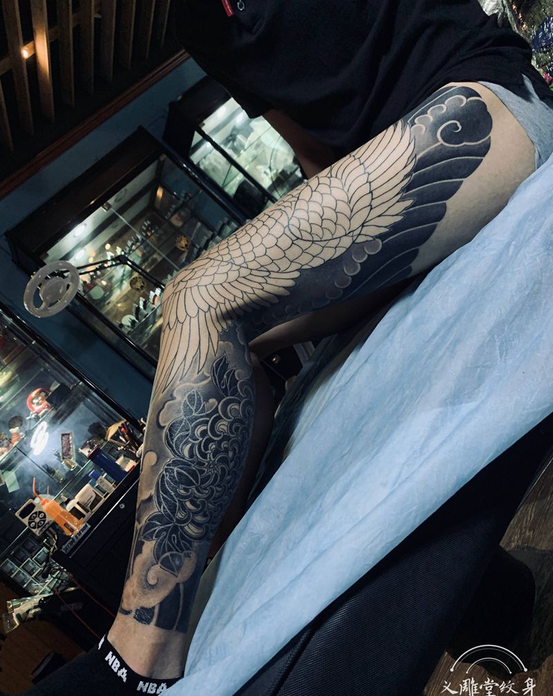 板雾习作纹身图片_腿部老传统义雕堂刺青纹身图案
