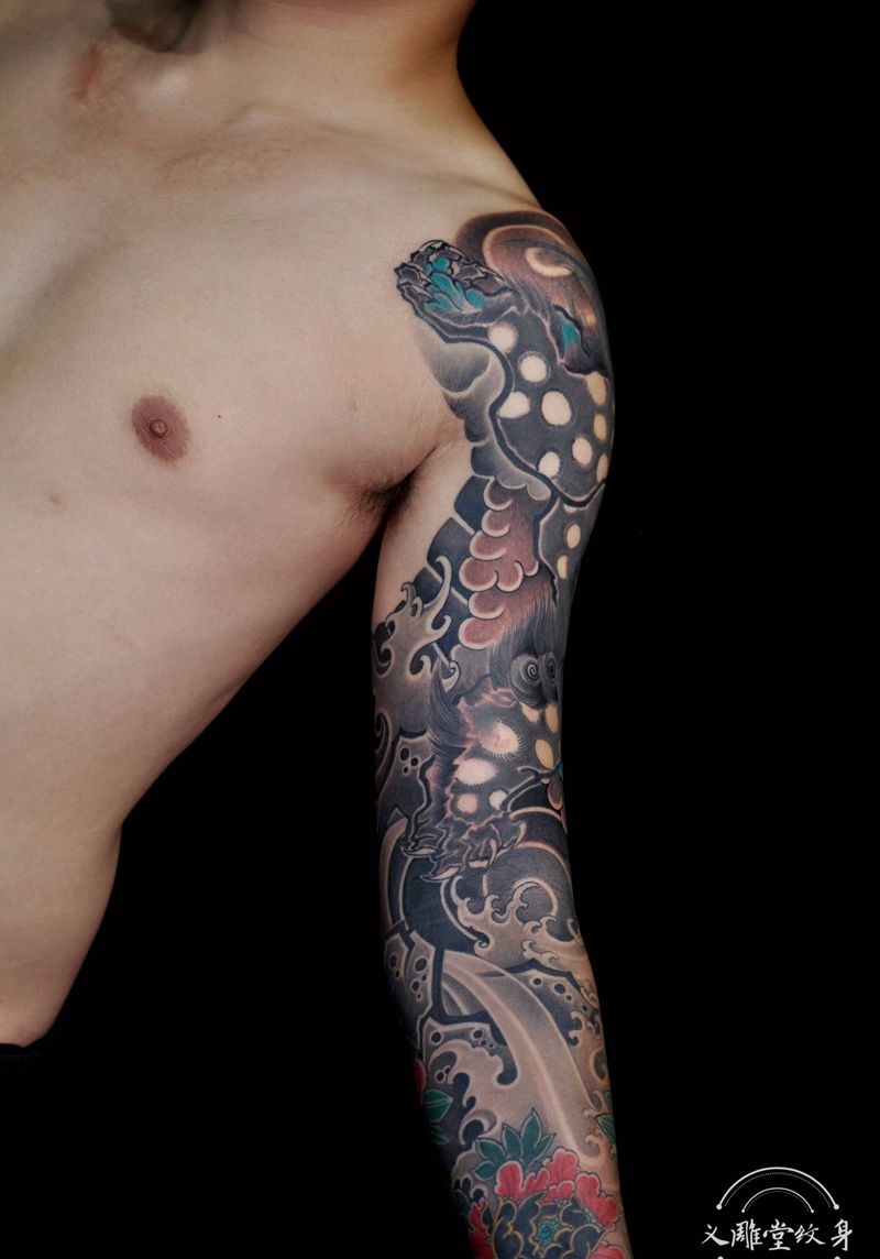 花臂唐狮子纹身图片_手臂老传统重庆纹身图案