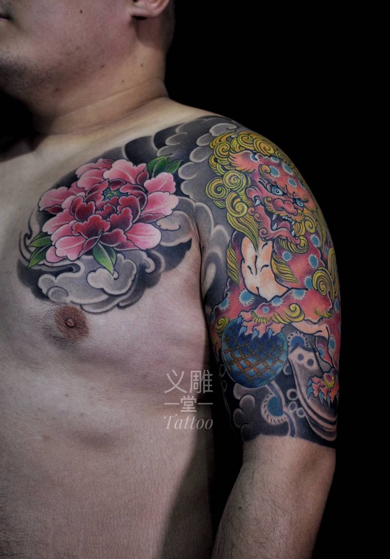 牡丹唐狮半胛纹身图片_胸部手臂老传统重庆纹身图案