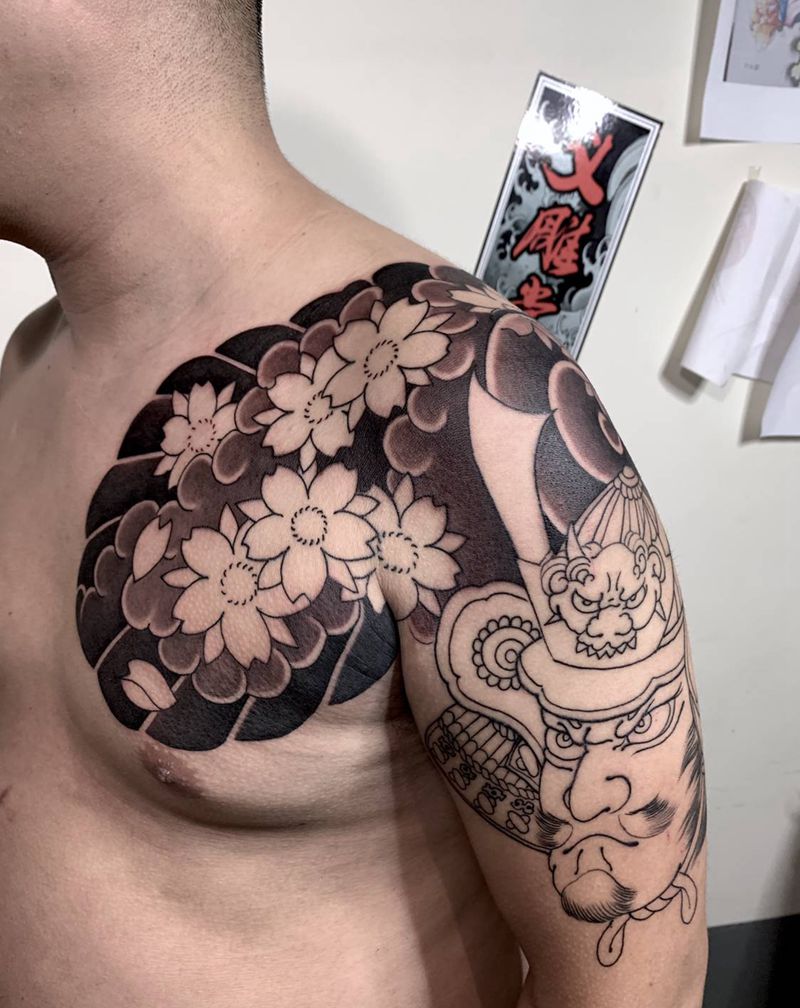当前位置: 首页 >重庆市纹身店-义雕堂纹身纹身图案>樱花武士半胛纹身图片_胸部老传统重庆纹身图案