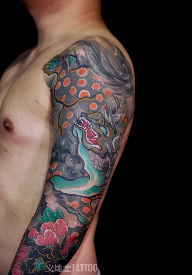 唐狮牡丹臂纹身图片_手臂老传统新传统重庆纹身图案