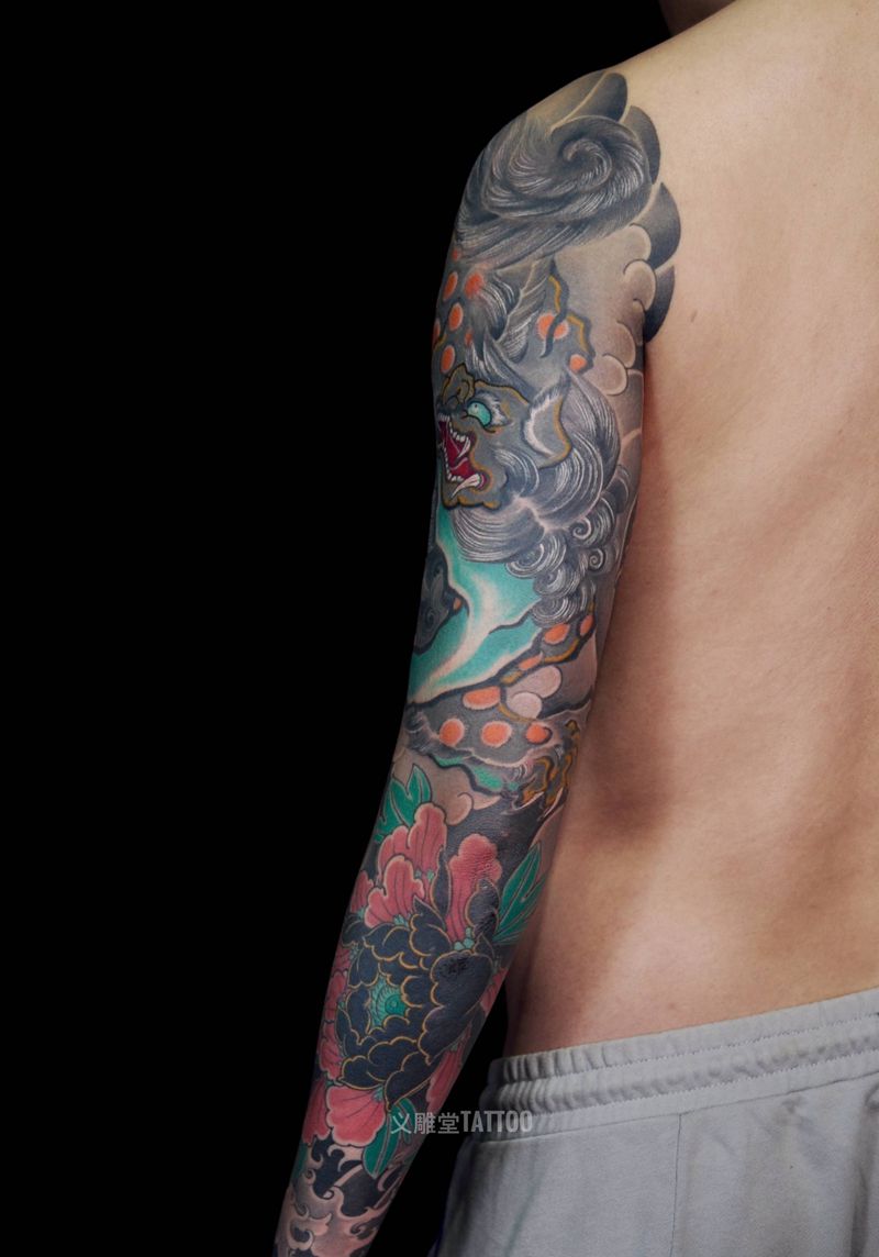 唐狮牡丹臂纹身图片_手臂老传统新传统重庆纹身图案