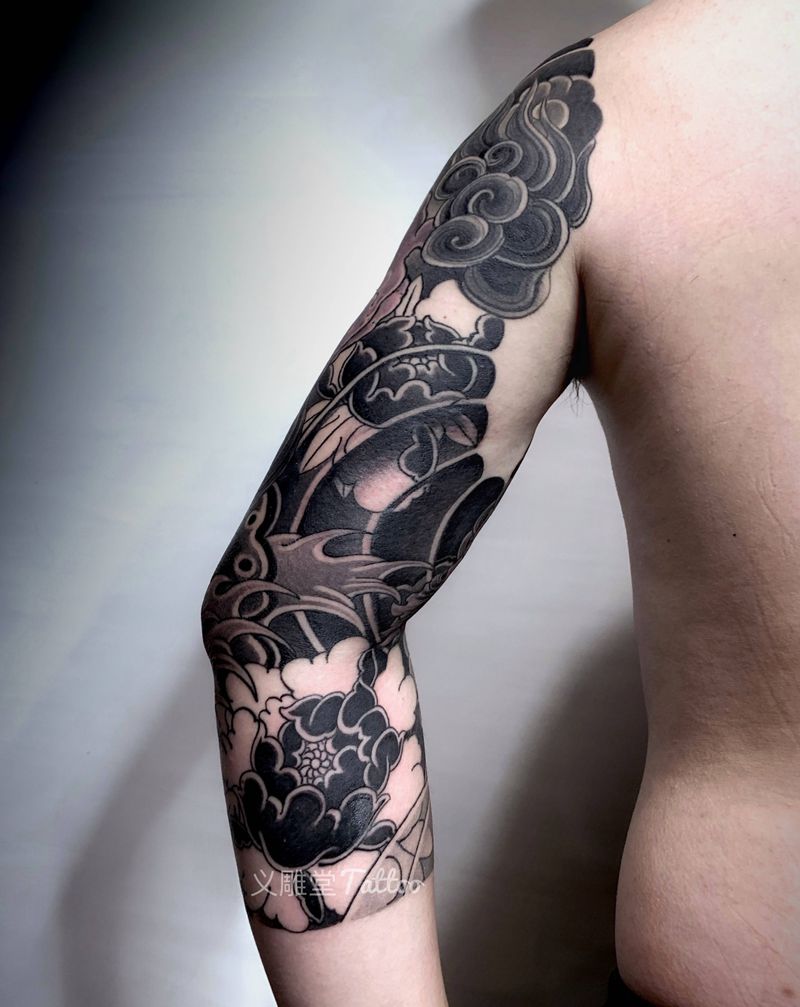 当前位置: 首页 >重庆市纹身店-义雕堂纹身纹身图案>福狮子七分臂刺青纹身图片_老传统纹身图案