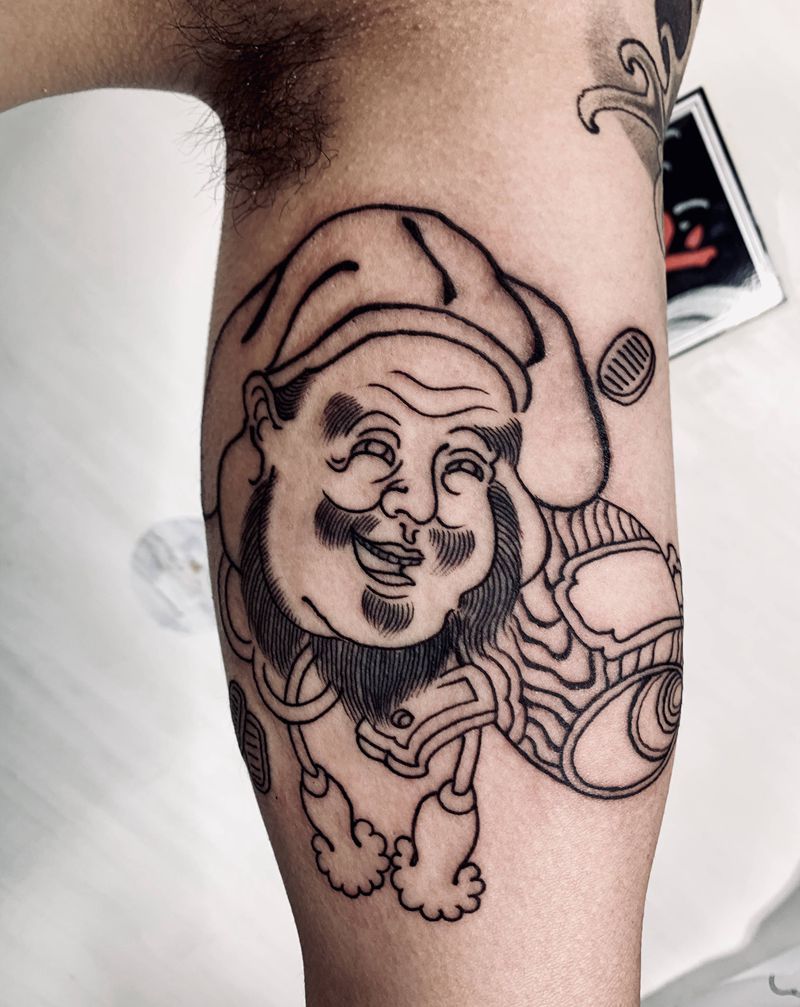 • T包小腿吹火男+阿多福纹身图片_腿部老传统新传统吹火男阿