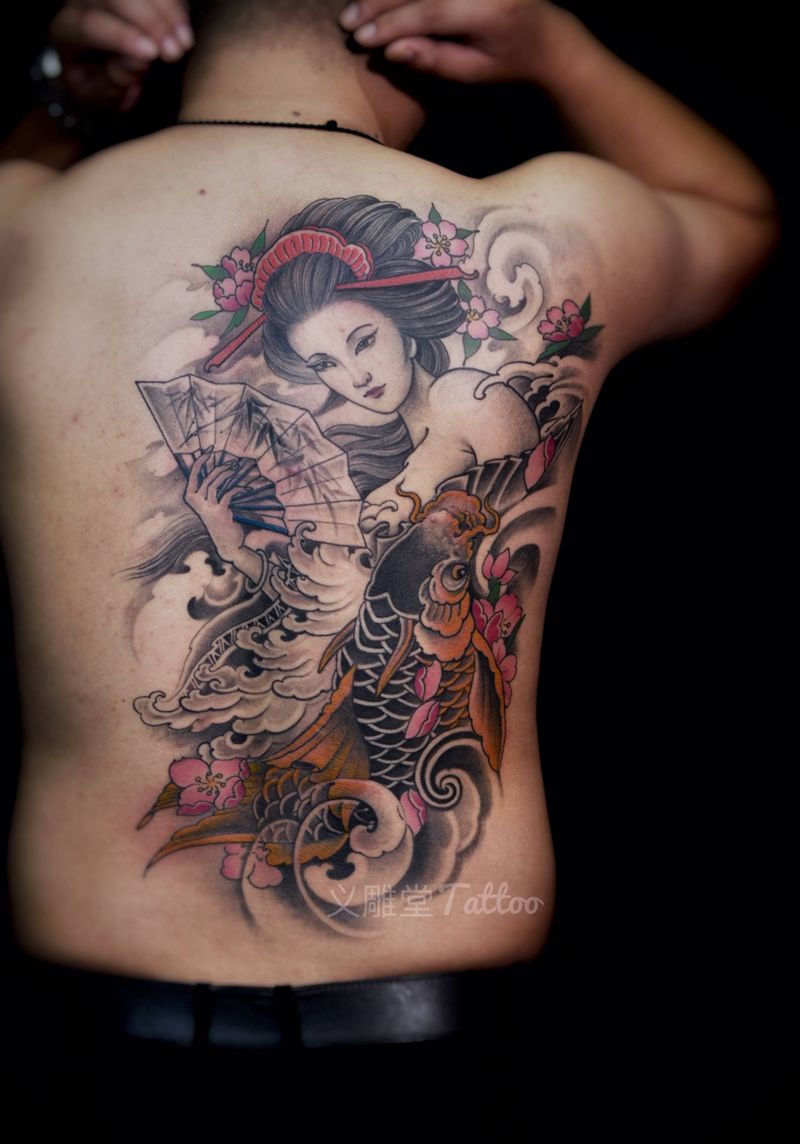 后背艺伎纹身纹身图片_背部新传统重庆纹身图案