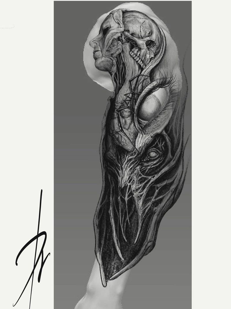 当前位置: 首页 >四川省成都市纹身店-現 刺青纹身图案>花臂设计稿纹身图片_暗黑纹身图案