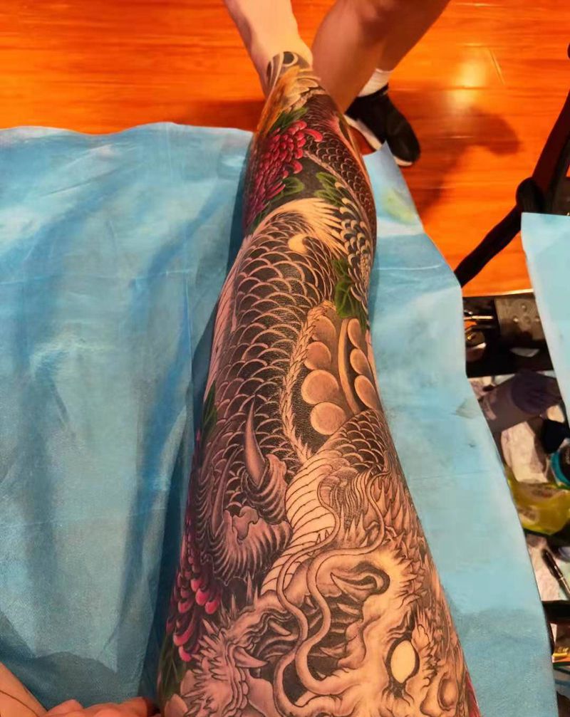 • T网红王老大花腿龙纹身图片_腿部新传统纹身图案