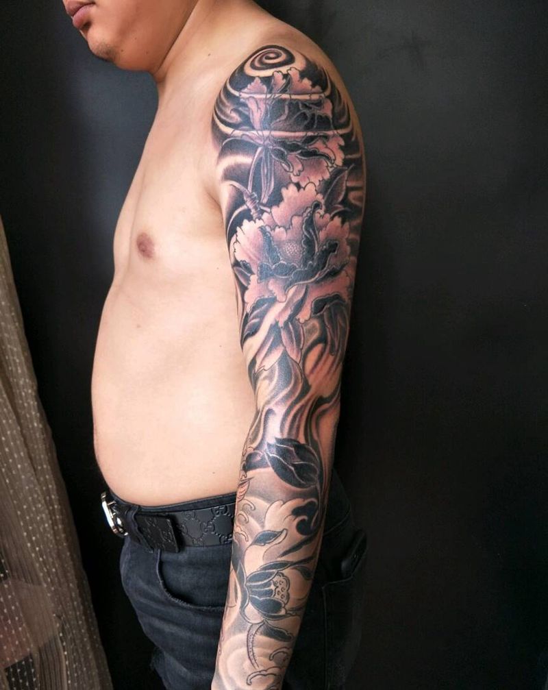 当前位置: 首页 >重庆市纹身店-重庆聚龙堂刺青纹身图案>黑灰花臂纹身图片_手臂传统肖像清新写实动物人物鬼神原创成品纹身图案