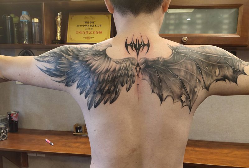 当前位置: 首页 >重庆市纹身店-重庆聚龙堂刺青纹身图案>天使恶魔翅膀纹身图片_背部欧美写实纹身图案