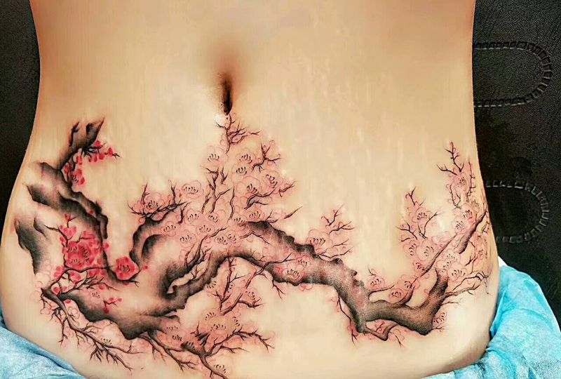 当前位置: 首页 >重庆市纹身店-重庆聚龙堂刺青纹身图案>疤痕妊娠纹梅花遮盖纹身图片_腹部传统清新写实国画植物原创成品纹身图案