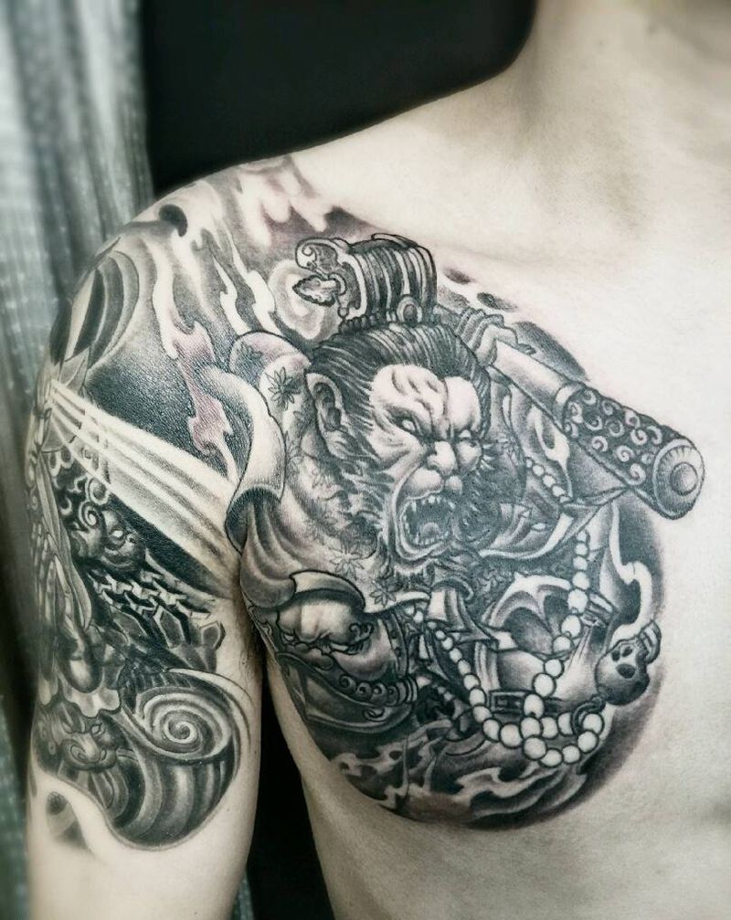当前位置: 首页 >重庆市纹身店-重庆聚龙堂刺青纹身图案>孙悟空半胛纹身图片_胸部传统原创成品纹身图案