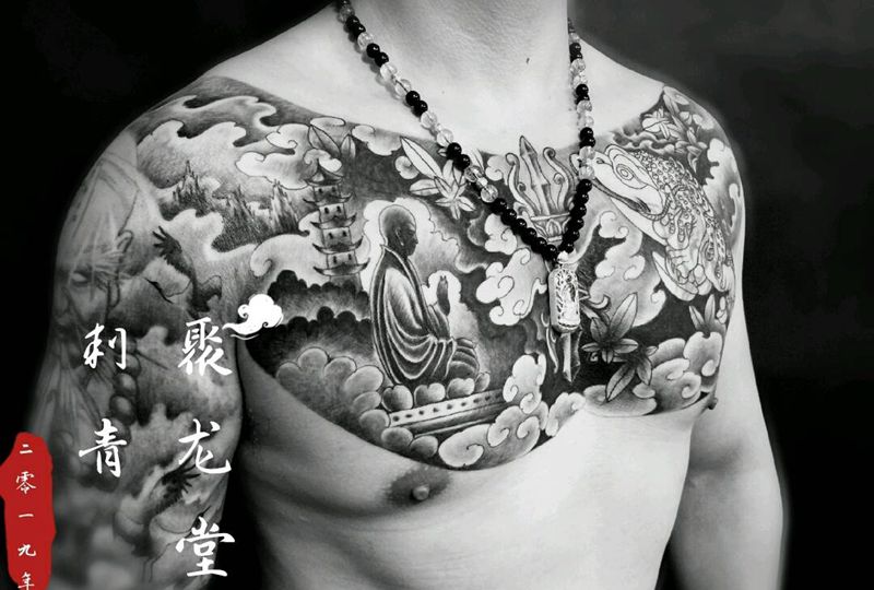 当前位置: 首页 >重庆市纹身店-重庆聚龙堂刺青纹身图案>花胸花臂拼接遮盖纹身图片_手臂胸部新传统纹身图案