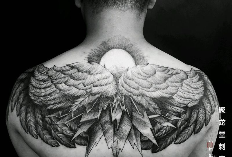 当前位置: 首页 >重庆市纹身店-重庆聚龙堂刺青纹身图案>翅膀纹身图片_背部点刺几何纹身图案