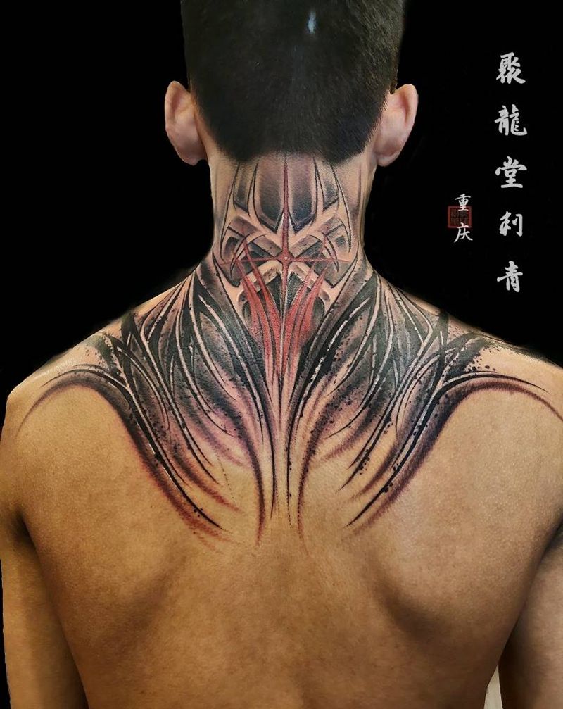 当前位置: 首页 >重庆市纹身店-重庆聚龙堂刺青纹身图案>脖子暗黑风格图腾纹身图片_颈部背部花体字图腾纹身图案