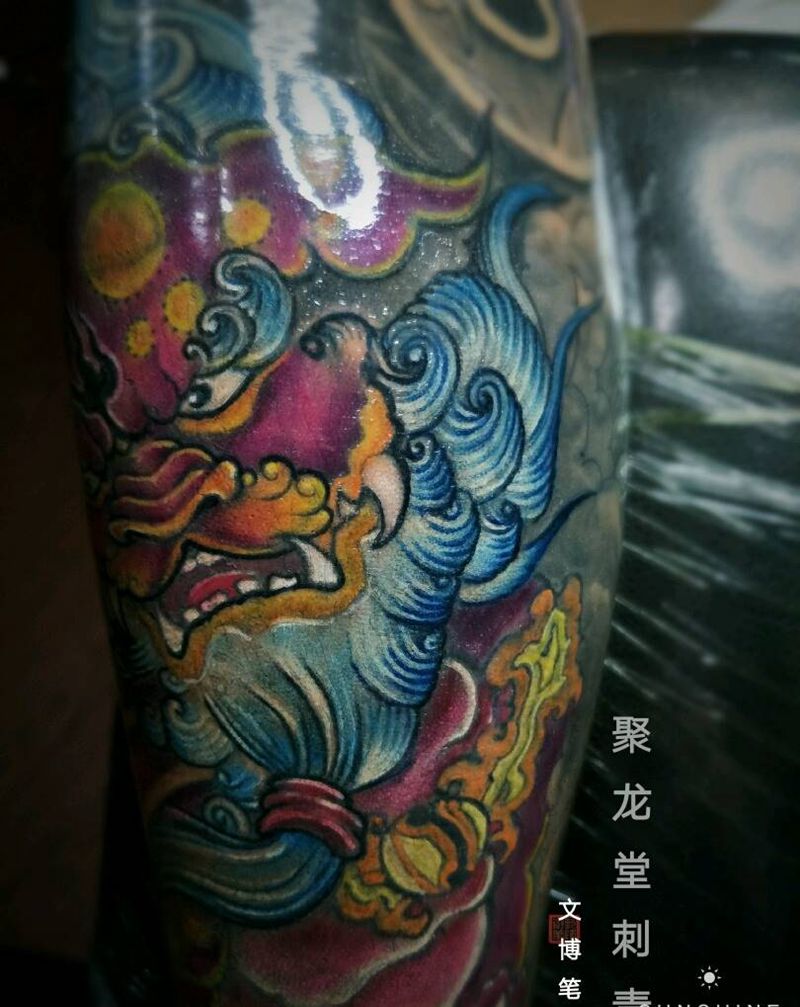 当前位置: 首页 >重庆市纹身店-重庆聚龙堂刺青纹身图案>象神唐狮遮盖纹身图片_手臂新传统水彩纹身图案