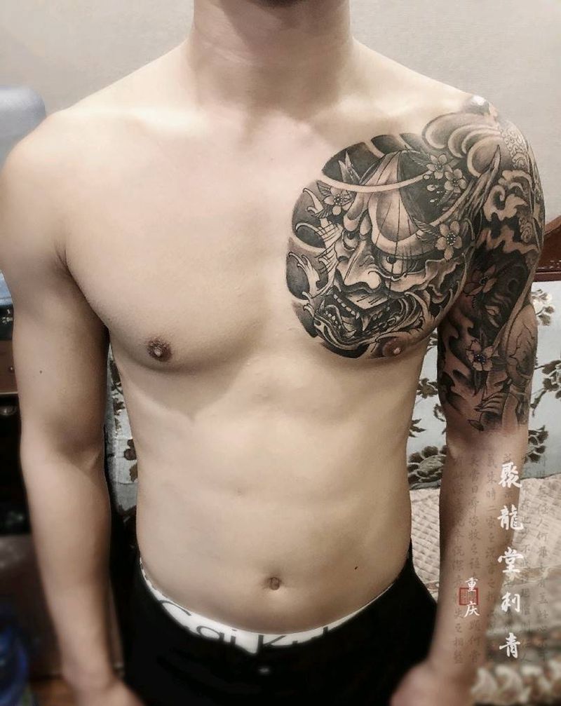 当前位置: 首页 >重庆市纹身店-重庆聚龙堂刺青纹身图案>艺妓般若半胛纹身图片_胸部手臂新传统老传统纹身图案