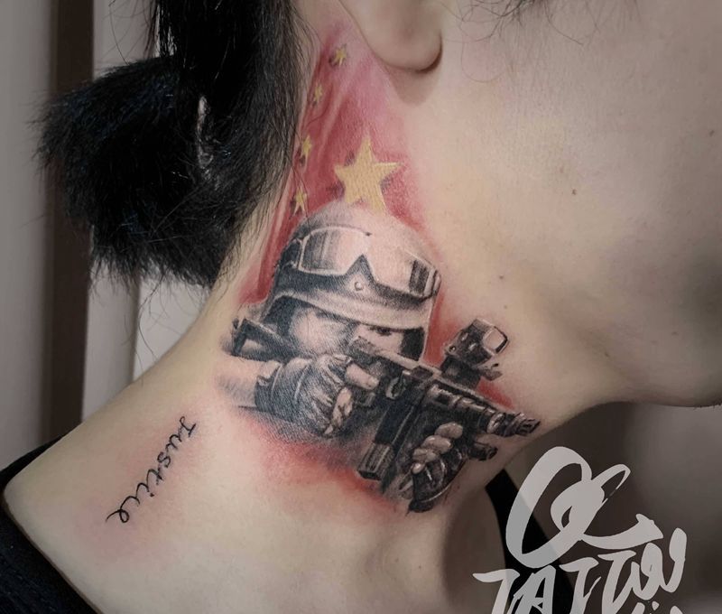 爱国主义纹身图片_颈部欧美写实纹身图案