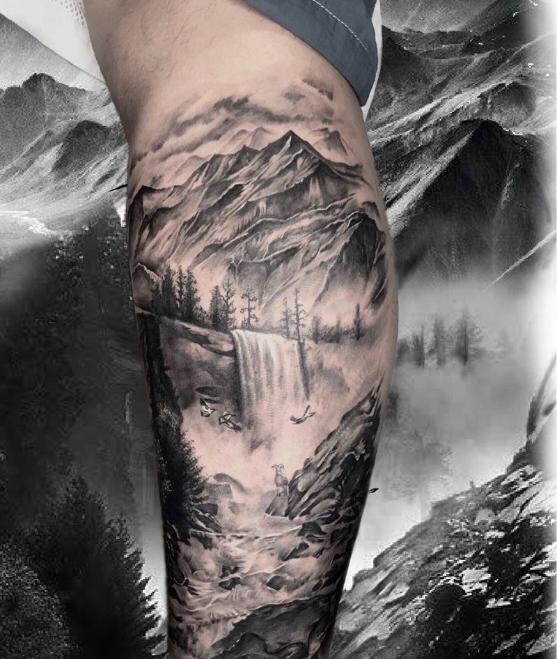 当前位置: 首页 >重庆市纹身店-風林刺青纹身图案>风景写实纹身图片_腿部欧美写实山水风景纹身图案