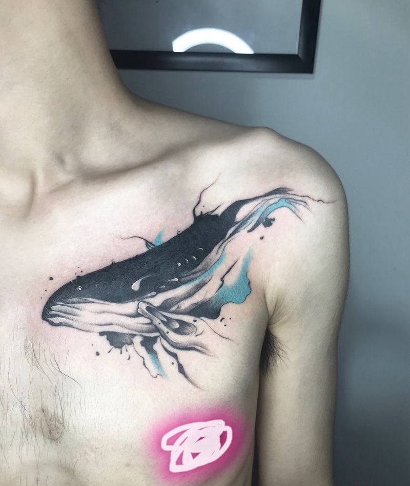 鲸鱼遮盖纹身图片_胸部水彩鲸鱼水彩纹身图案