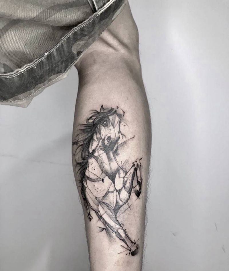 骏马纹身图片_腿部欧美写实水墨纹身图案