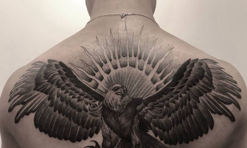 鹰纹身图片_背部欧美写实点刺纹身图案
