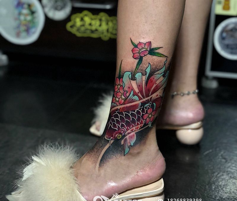 金鱼纹身图片_腿部脚部新传统鬼绣文化金鱼纹身图案