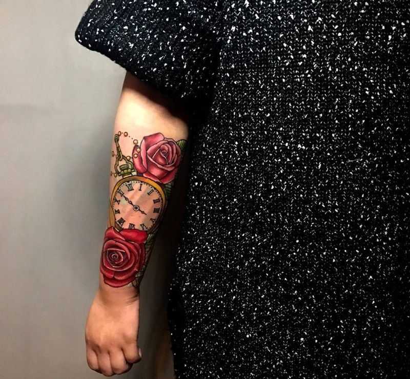 当前位置: 首页 >重庆市纹身店-鬼绣刺青纹身图案>玫瑰钟表纹身图片_成品手臂欧美静物刺青原创纹身图案
