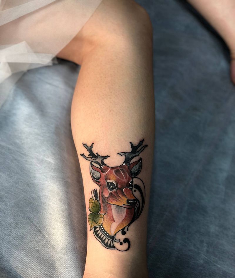 鹿纹身图片_腿部小清新纹身图案