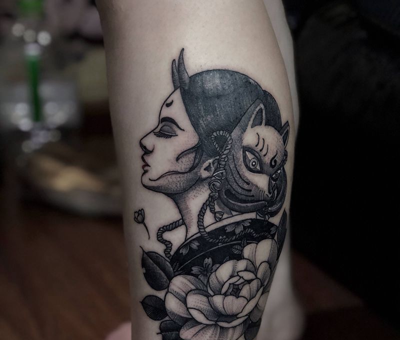 艺妓纹身图片_腿部点刺新传统艺妓鬼绣文化纹身图案