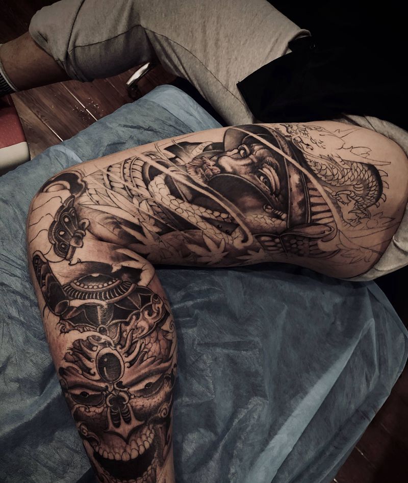 • T网红王老大花腿龙纹身图片_腿部新传统纹身图案