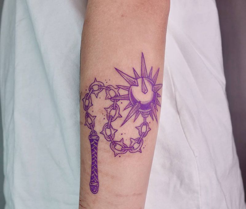 当前位置: 首页 >重庆市纹身店-欢喜社刺青纹身图案>流星锤纹身图片_手臂New School纹身图案