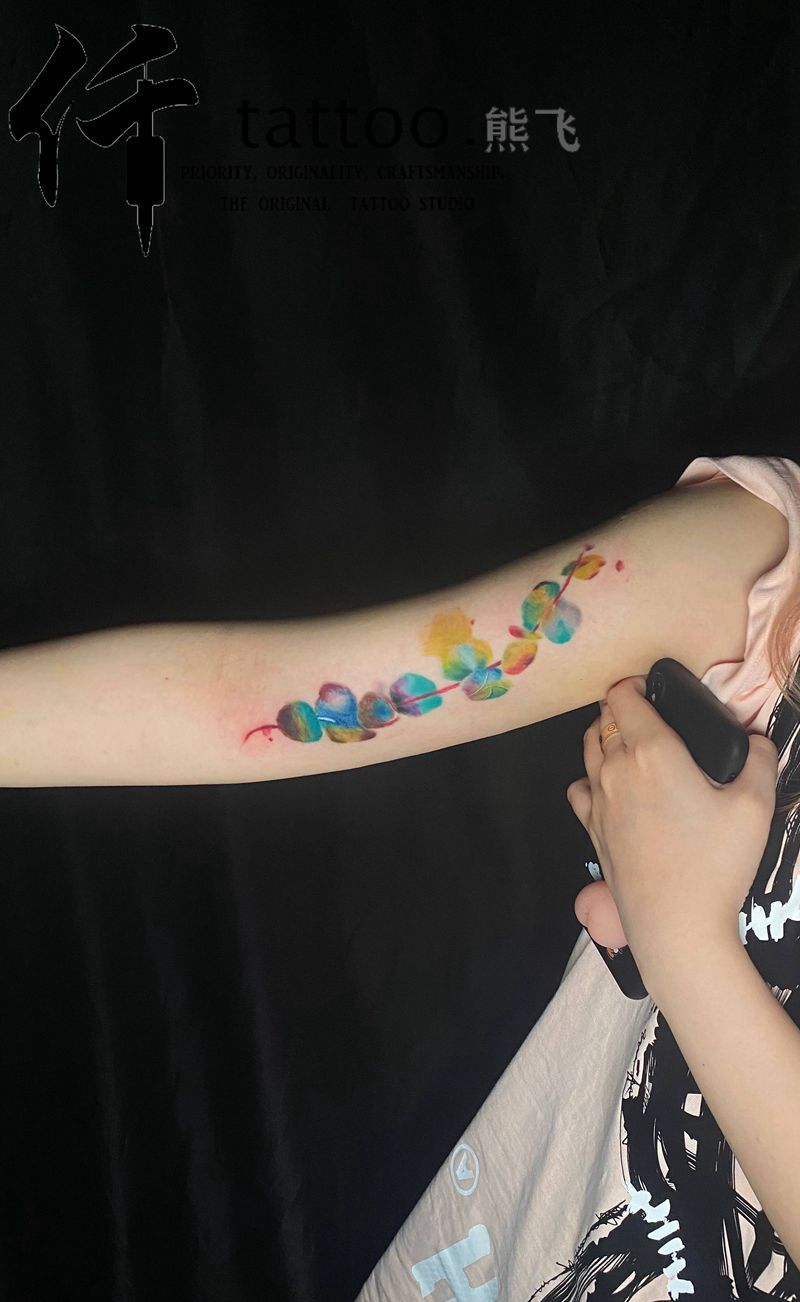 当前位置: 首页 >重庆市纹身店-仟刺青纹身图案>尤加利叶纹身图片_手臂水彩纹身图案