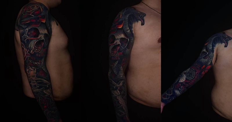 当前位置: 首页 >重庆市纹身店-仟刺青纹身图案>骷髅与蛇纹身图片_手臂欧美写实暗黑,恐怖纹身图案