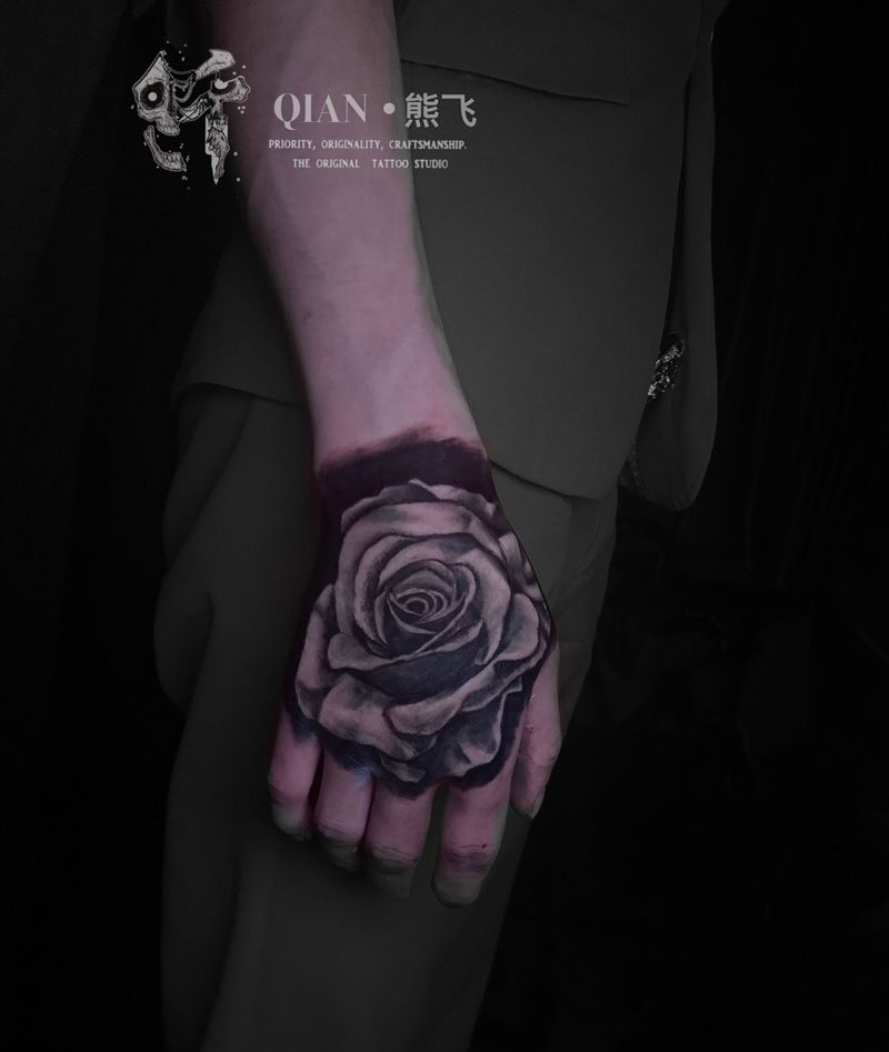 黑灰写实玫瑰纹身图片_手部欧美写实纹身图案