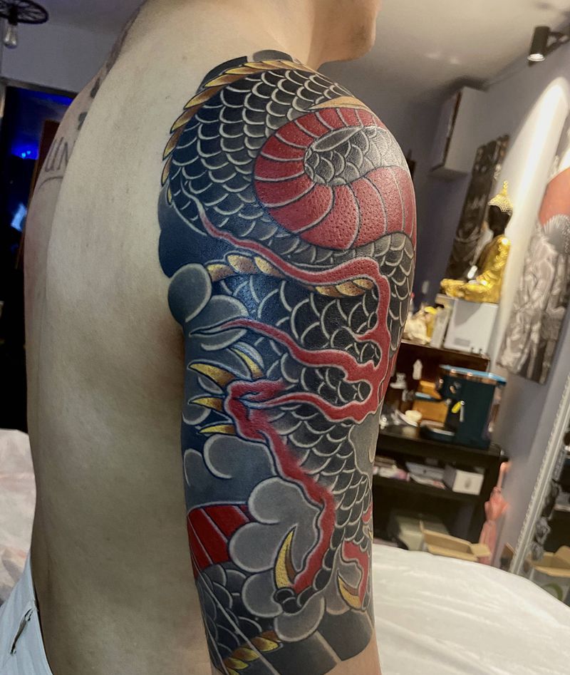 • T网红王老大花腿龙纹身图片_腿部新传统纹身图案