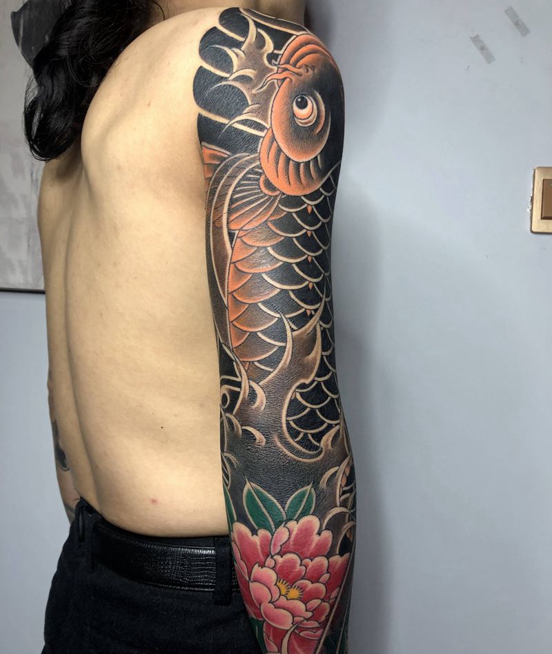 原创锦鲤花臂纹身图片_手部手臂老传统鱼花臂重庆纹身图案
